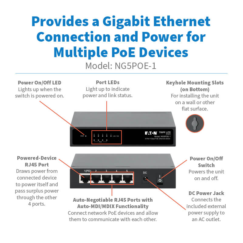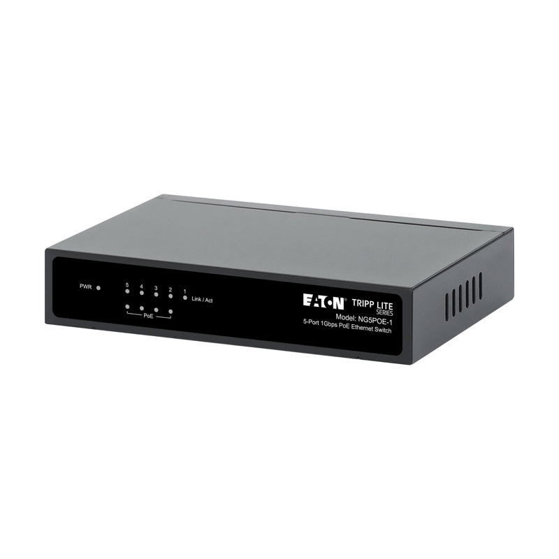 Tripp Lite series 5-Port 10/100/1000 Mbps PoE-Powered Desktop Gigabit Ethernet Unmanaged Switch with PoE+ Pass-Through, 65W, Metal Enclosure - Part Number: NG5POE-1